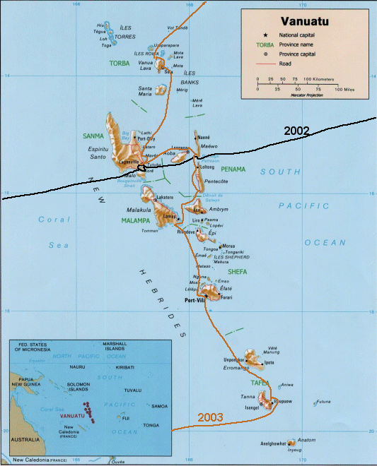 Melanesia May 2003 Australia -> New Caledonia (Noumea) (map) June 2003 New Caledonia -> Vanuatu (Tanna) (map) July 2003 Vanuatu (Port Vila) August 2003 Vanuatu (Port Vila, Maskelyne Islands) September 2003 Vanuatu (Awei, Pentacost, Maewo, Ambae, Santo) October 2003 Vanuatu (Santo, Banks) -> Kiribati (Tarawa) (map)